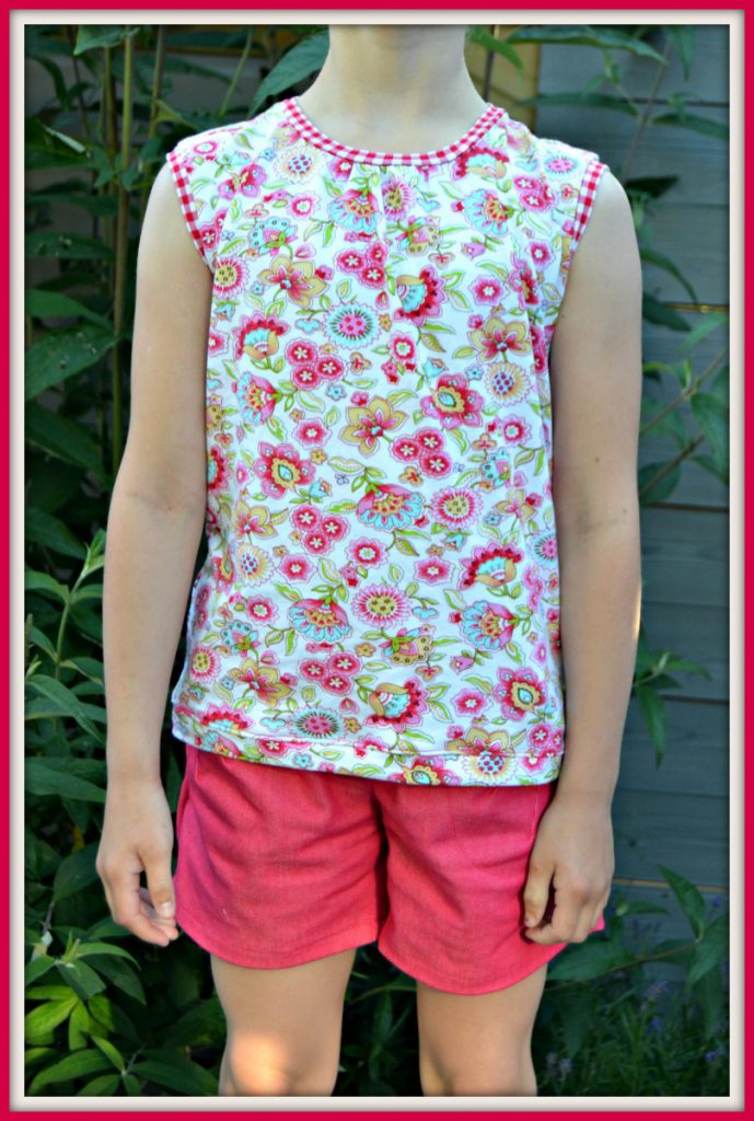 Een paar weken geleden al naaide ik deze korte broek voor dochter. Helaas werkte het weer niet echt mee, zodat het werkloos in de kast belandde. Met de mooie weersvooruitzichten op komst, besloot ik zaterdag er nog een topje bij te maken. Ik had in mijn voorraad nog een heel klein restje van één van mijn favoriete stoffen, waar nog precies dit topje uit kon. Ik had alleen nog wat snippertjes stof over.