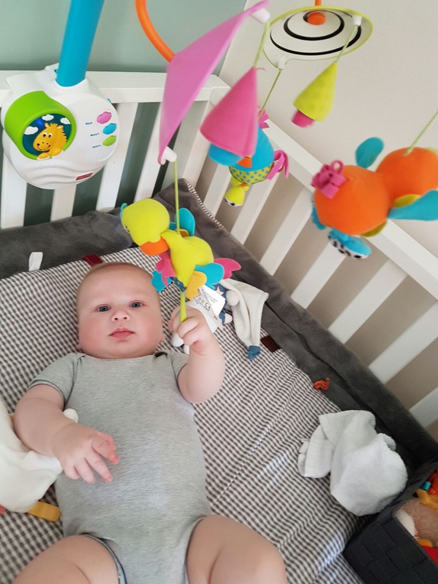 Ondertussen ligt Jur lekker in de box te spelen. Hij heeft het sinds kort op de boxmobiel voorzien, het lukt hem nu met regelmaat om zo’n vliegende vogel boven zijn hoofd vast te grijpen en er dan hard aan te trekken. Zie ook die zelf-voldane blik 🙂