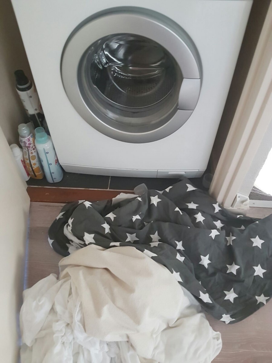 De was is klaar, ik krijg gelukkig hulp van Senn bij het ophangen. Hij heeft nogal eigen ideeën over de plek waar de wasknijper moet.