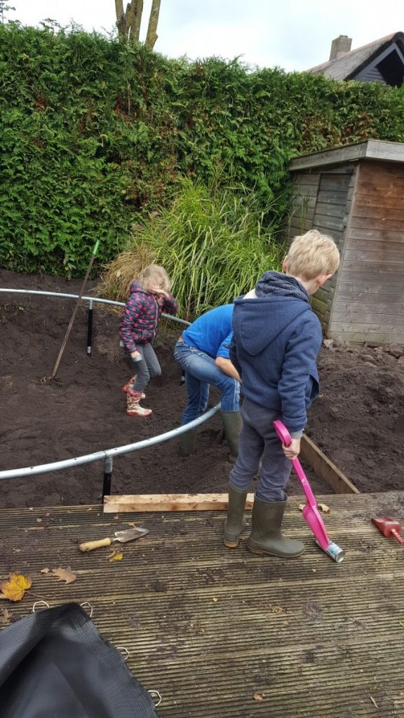 Vandaag zijn man en kinders vooral druk geweest met het ingraven van de trampoline. Na lang twijfelen hebben we toch maar besloten het ding in het gat van de vijver te plaatsen. Dat was een hele klus, maar ik ben er erg blij mee.