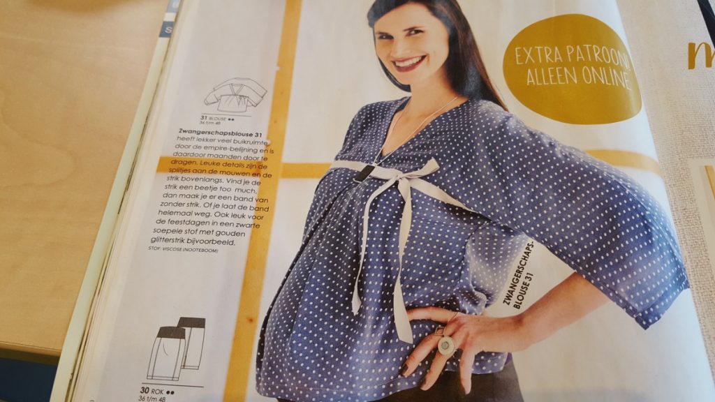 Dit patroon voor een zwangerschapsblouse kwam ik tegen in de nieuwste Knippie. Misschien ligt het aan mij, maar zo’n band rond je borst lijkt me niet erg comfortabel. (Ik laat me er maar niet over uit of dit modisch verantwoord is, daar heb ik geen verstand van 😉 )