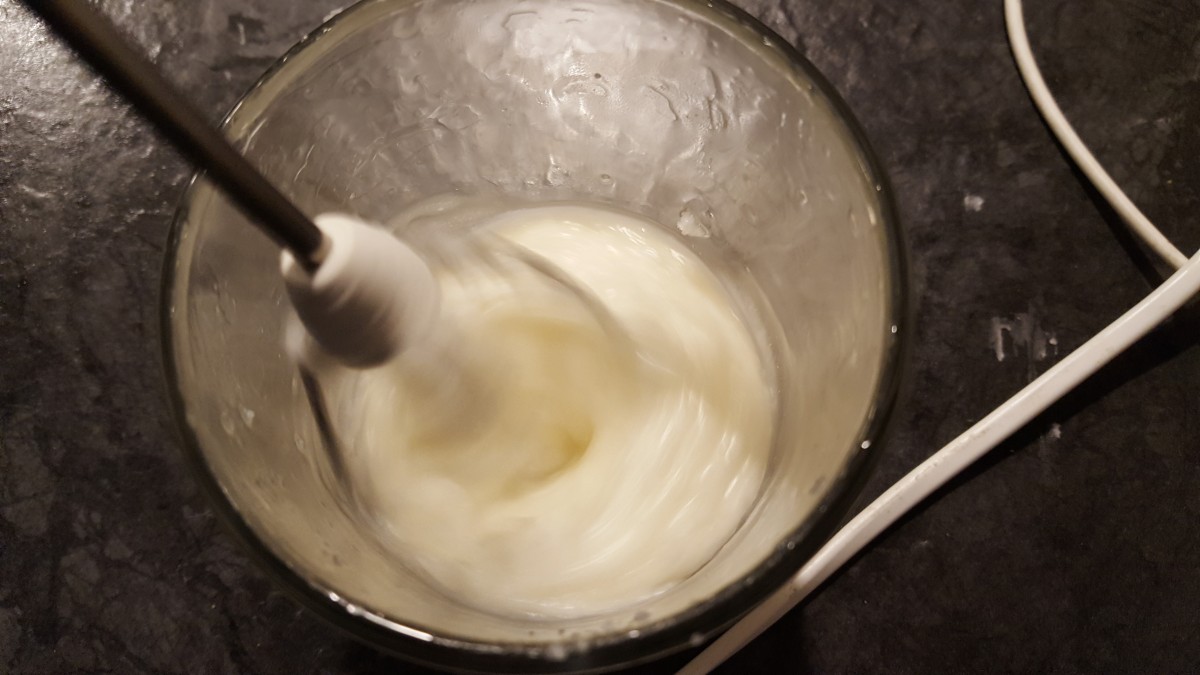Mijn oogmakeup-reiniger was bijna op dus maakte ik nieuwe. Heel simpel: kokosolie iets zacht laten worden in de magnetron en daarna even opkloppen met de mixer.