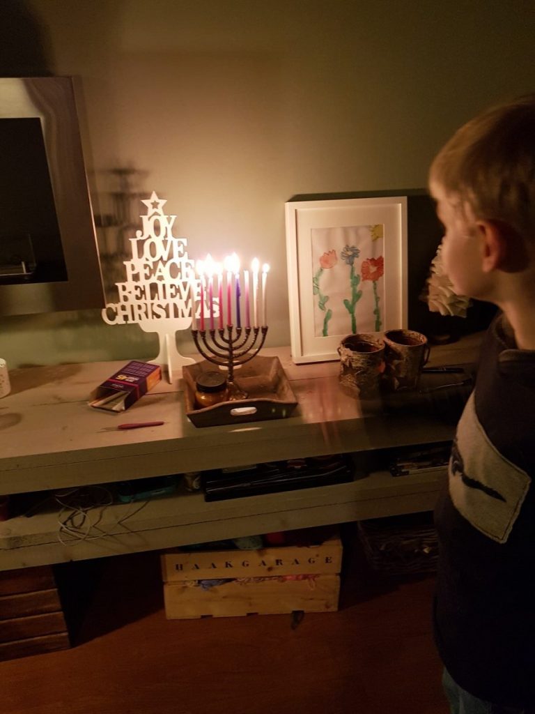 Kinderen en vuur, het blijft toch een magische combinatie. Kaarsjes aansteken vinden ze helemaal geweldig hier in huis, dus ik hoefde dit jaar geen enkele keer zelf de chanoeka-kaarsen aan te steken. Hier branden ze allemaal, mooi he?