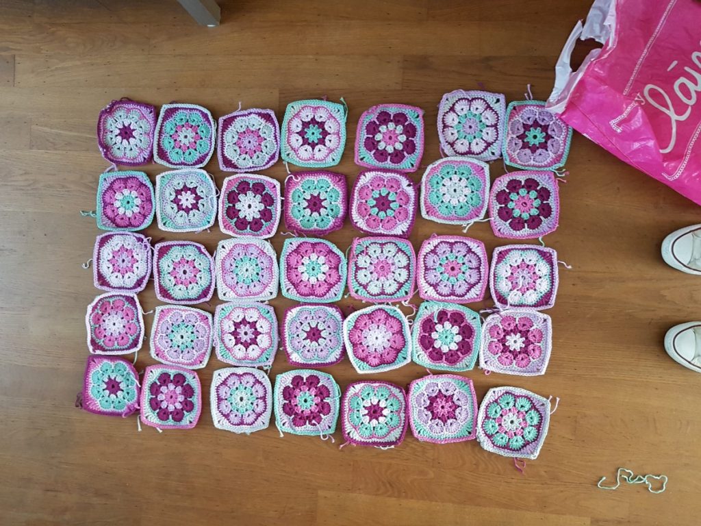 Met deze deken ben ik de afgelopen week flink opgeschoten. 35 vierkantjes zijn af en klaar om in elkaar gezet te worden. Denk trouwens dat het een dekentje wordt voor in de kinderwagen. De kleine dame heeft per slot van rekening nog maar 4 gehaakte dekentjes, daar kan er best nog één bij.