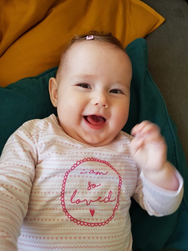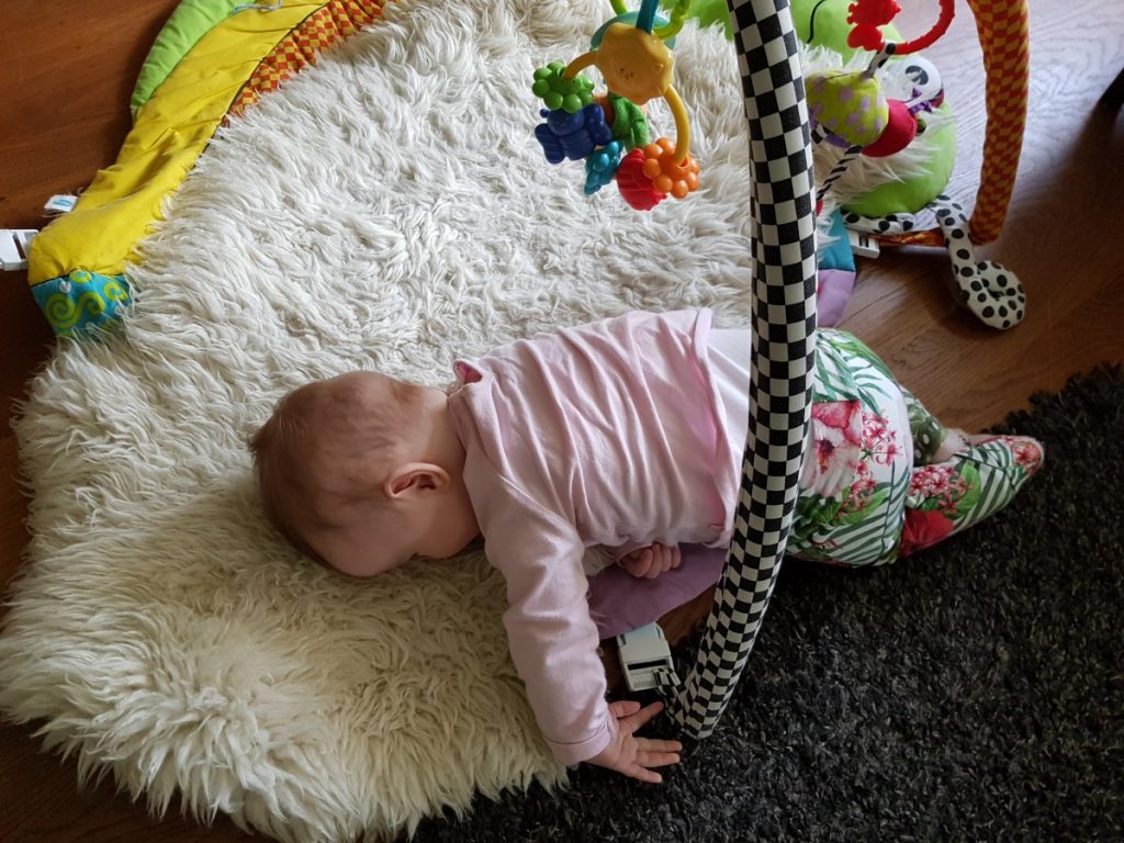 Ook is ze druk aan het oefenen met draaien. Zo’n heerlijke fase is dat, dat het wel lukt om op de buik te draaien, maar dat ze dan zo ongelukkig liggen dat ze niet weer terug kunnen.
