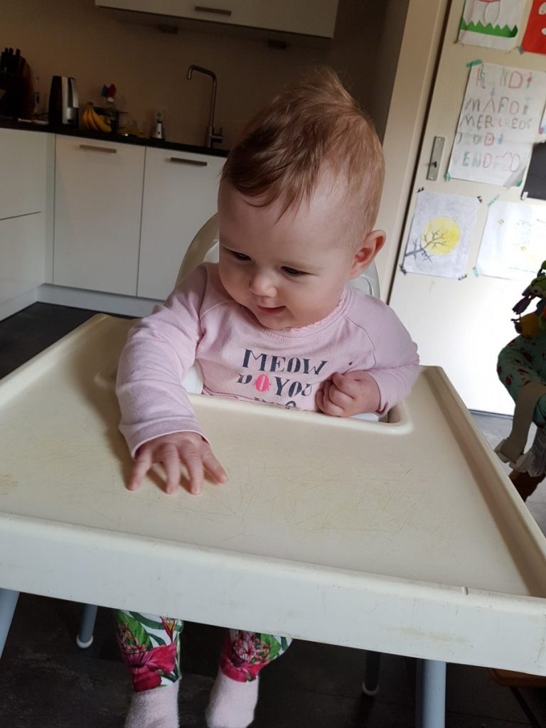 Man haalde vandaag de kinderstoel van zolder. Natuurlijk is ze nog wat jong om er lang in te zitten, maar een paar minuutjes ging prima. Weer een nieuwe fase…