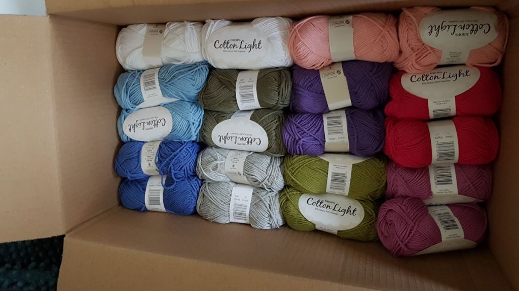 Ik had niet genoeg garen voor de deken hierboven, dus deed ik samen met vriendin M. een bestelling bij Hobbydoos, de enige online shop die het garen dat ik gebruikte nog had. Dat is toch wel het risico van garen een poos op zolder bewaren, dat het opeens uit de handel wordt genomen. Niet aan mijn man vertellen hoor, maar het zou kunnen dat ik nog een ‘klein beetje’ extra garen heb mee besteld voor een nieuw project.. 😎
