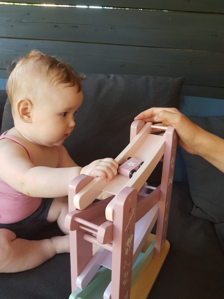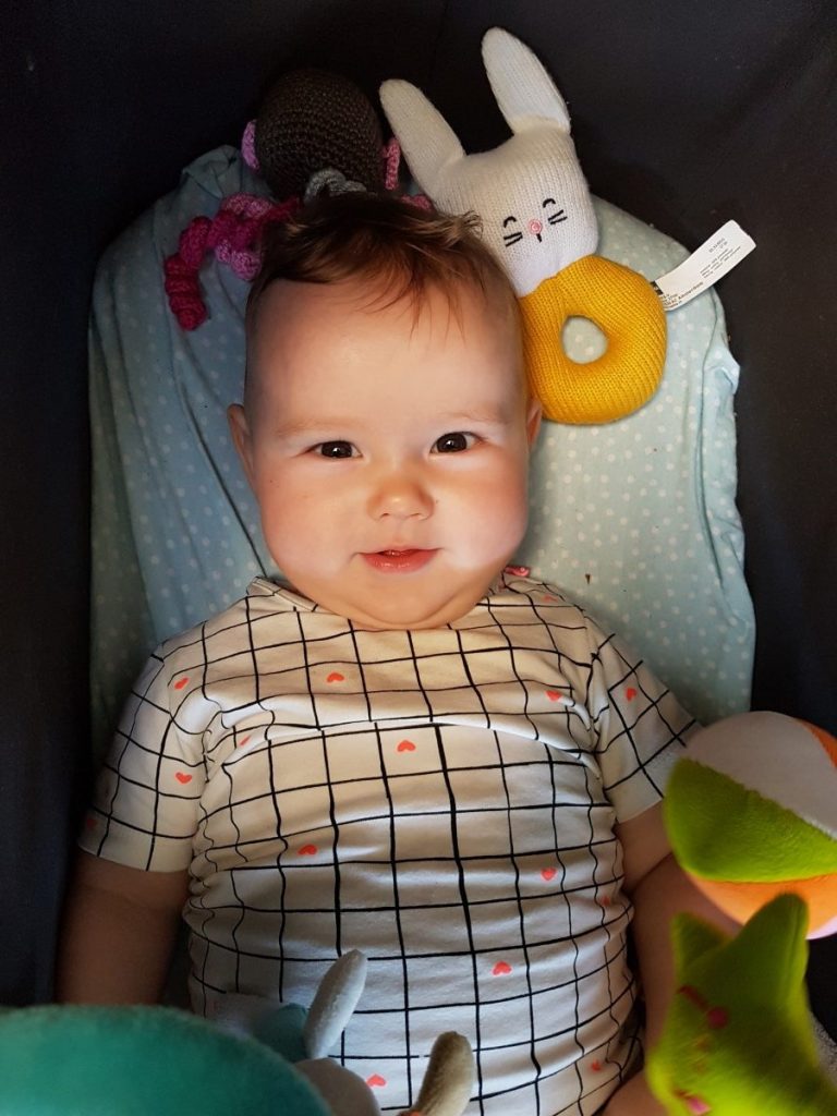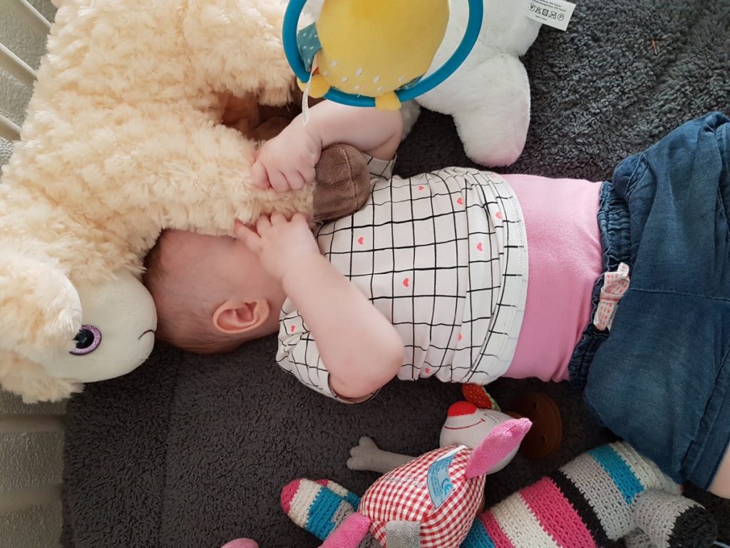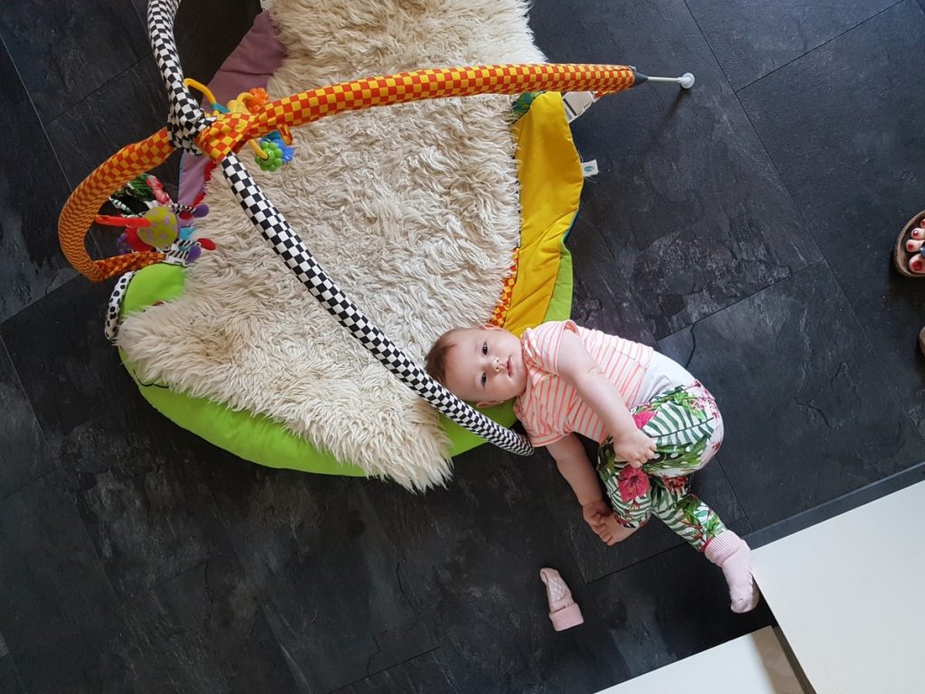 En deze week lukte het voor het eerst om op haar buik te draaien, zonder dat haar armen hopeloos klem kwamen te liggen. Logisch dat ze zo trots kijkt!