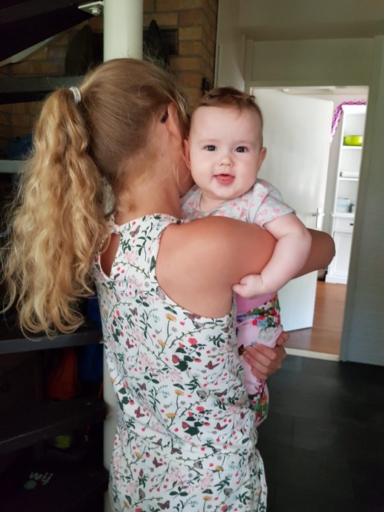 Helemaal blij dat haar grote zus uit school is!