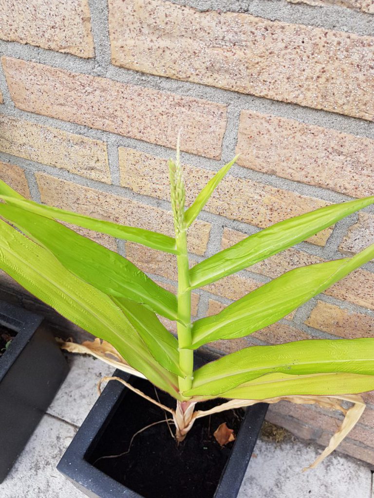 Ik begin met wat (moes)tuinfoto’s. Oudste zoon vond op school wat gedroogde maiskorrels en heeft die geplant. Ondanks mijn scepsis (dat wordt nooit wat!) is er een plant gegroeid.